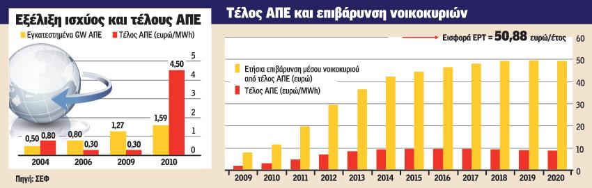 Η υλοποίηση όλων αυτών των φωτοβολταϊκών απαιτεί δισεκατομμύρια ευρώ ετησίως, που θα πρέπει να συγκεντρώνονται από όλους τους πολίτες της χώρας μέσω του τέλους υπέρ ΑΠΕ που πληρώνουν μαζί με το λογαριασμό της ΔΕΗ, προκειμένου να εξοφλούνται οι παραγωγοί. Αξίζει να σημειωθεί ότι φέτος το τέλος υπέρ ΑΠΕ από 0,30 ευρώ/Mwh αυξήθηκε στα 4,5 ευρώ/MWH, πάνω από 1.500 % αύξηση, προκειμένου να καλυφθεί το έλλειμμα που είχε αρχίσει να παρουσιάζει ο ΔΕΣΜΗΕ το 2009 για την αποπληρωμή περίπου 1.000 MW σε αιολικά (που έχουν πολύ χαμηλότερη εγγυημένη τιμή γύρω στα 90 ευρώ/Mwh) και γύρω στα 45 MW φωτοβολταϊκών!