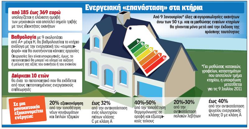 Πρόκειται ουσιαστικά για την αποτύπωση από ειδικευμένο τεχνικό της ενεργειακής συμπεριφοράς του κτηρίου. Δηλαδή τι ενέργεια καταναλώνει για ψύξη - θέρμανση, ποια η απώλεια θερμικής ενέργειας, πώς λειτουργούν λέβητες, καυστήρες, σωληνώσεις, ο κλιματισμός, η θερμομόνωση του κελύφους δηλαδή μονώσεις ταράτσας, τοιχοποιίας, κουφωμάτων. Ο επιθεωρητής στη συνέχεια και με βάση κάποιους δείκτες θα ταξινομεί το κτήριο σε κατηγορίες ενεργειακής συμπεριφοράς (από Α+ μέχρι Η). Θα προτείνει επίσης σειρά εργασιών, ώστε το κτήριο να γίνει λιγότερο ενεργοβόρο χωρίς αυτό να σημαίνει ότι ο ιδιοκτήτης είναι υποχρεωμένος να τις κάνει. Η «πράσινη» ταυτότητα θα έχει διάρκεια 10 ετών. 2 Πότε πρέπει να εκδοθεί το πιστοποιητικό;Αφορά τόσο τις νέες οικοδομές όσο και τις υπάρχουσες και θα πρέπει να εκδίδεται για κάθε μεταβίβαση, δηλαδή αγοραπωλησία, κληρονομιά, γονική παροχή ή για κάθε αλλαγή πολεοδομικής φύσεως όπως ανακαινίσεις, προσθήκες επί της οικοδομής κ.λπ. Είναι υποχρεωτικό για κάθε κτήριο πάνω από 50 τ.μ. και θα πρέπει σε κάθε συμβόλαιο που γίνεται η έκδοση άδειας να υπάρχει αριθμός πρωτοκόλλου και αντίγραφο του πιστοποιητικού. Για τις νέες οικοδομές θα πρέπει να υπάρχει οπωσδήποτε, αλλιώς δεν θα γίνεται σύνδεση με τη ΔΕΗ. Οι επιθεωρητές θα περνούν από κόσκινο τη μελέτη ενεργειακής απόδοσης ενός κτηρίου κι αν δεν πληροί τις προδιαγραφές του ΚΕΝΑΚ θα πρέπει σε ένα χρόνο να προχωρεί σε απαραίτητες εργασίες. Στις μισθώσεις δόθηκε παράταση 6 μηνών, αλλά από τις 9 Ιουλίου 2011 θα είναι υποχρεωτικό το πιστοποιητικό και για τις ενοικιάσεις κατοικιών, καταστημάτων, γραφείων. Επίσης, δεν αφορά στα υφιστάμενα συμβόλαια ενοικίασης, τροποποιήσεις συμβολαίων, μισθώσεις πρατηρίων, πάρκινγκ. 3 Και γιατί να βγάλω πιστοποιητικό, αφού δεν είμαι υποχρεωμένος να προχωρήσω σε εργασίες;